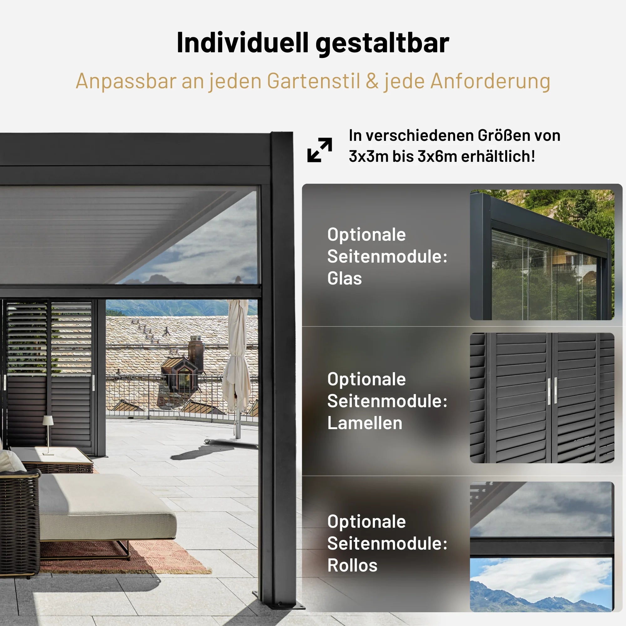Mit den Sky Pergola Seitenrollos, Lamellenwänden oder Glaswänden können die Seiten flexibel geschlossen und der Wind effektiv reduziert werden – für noch mehr Komfort bei jedem Wetter.