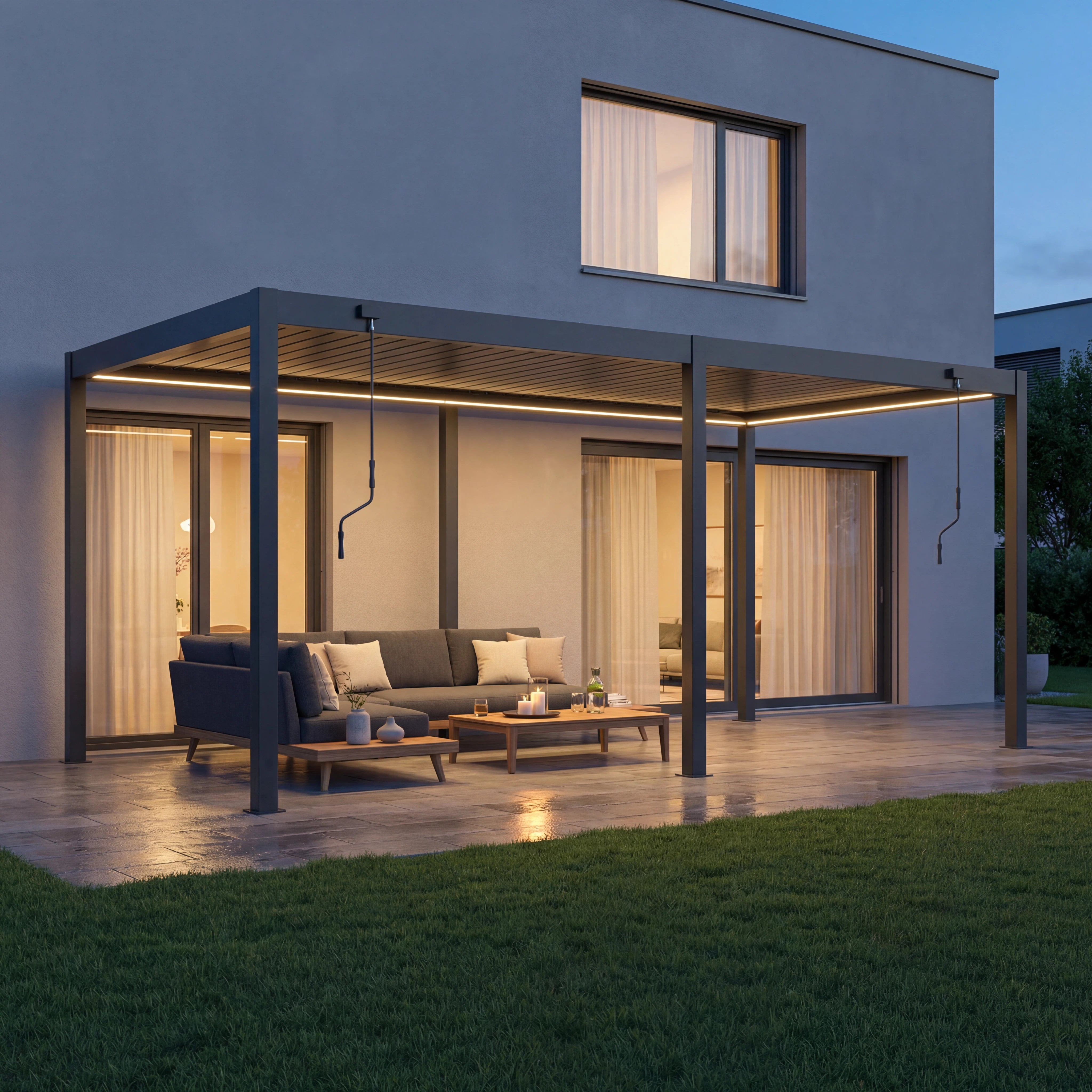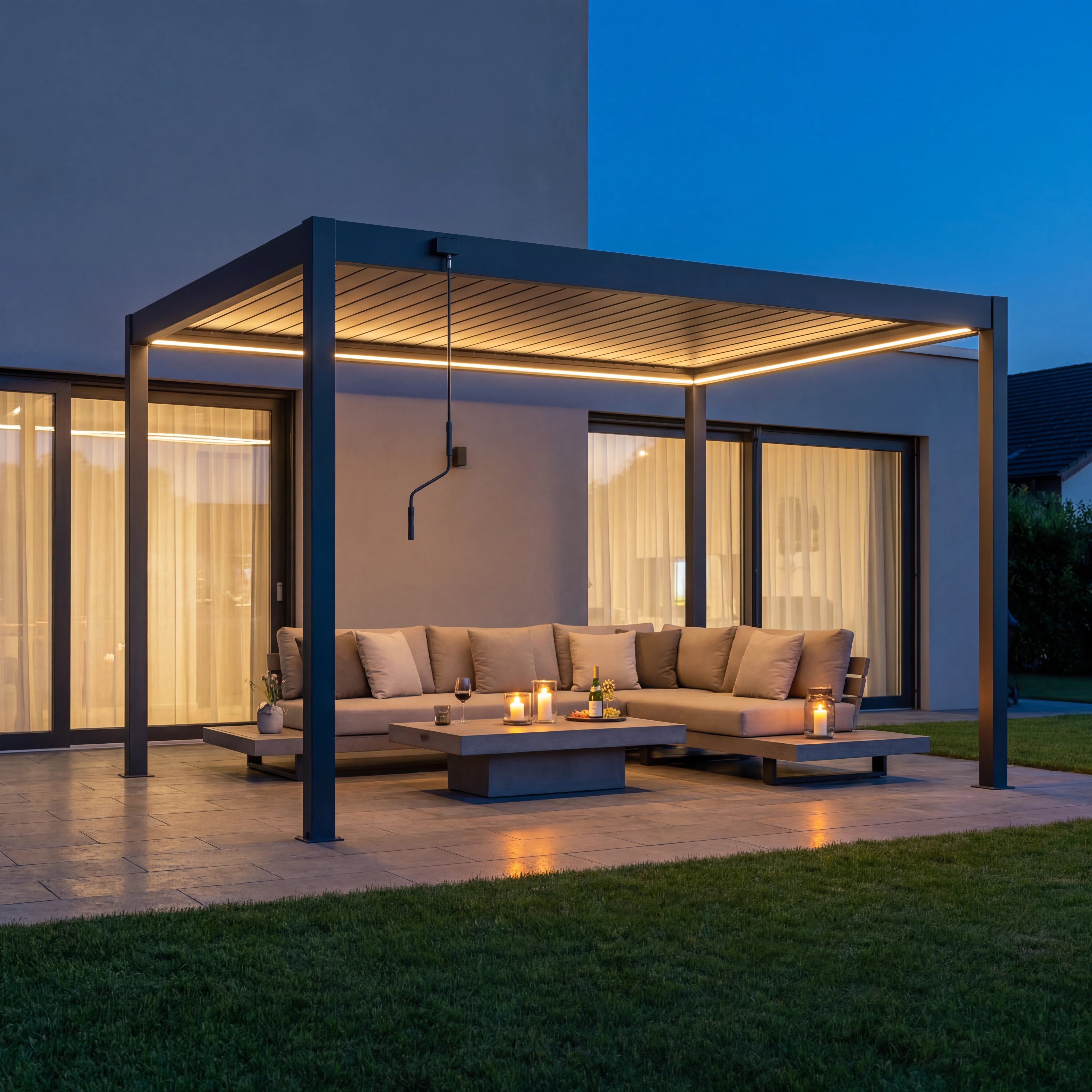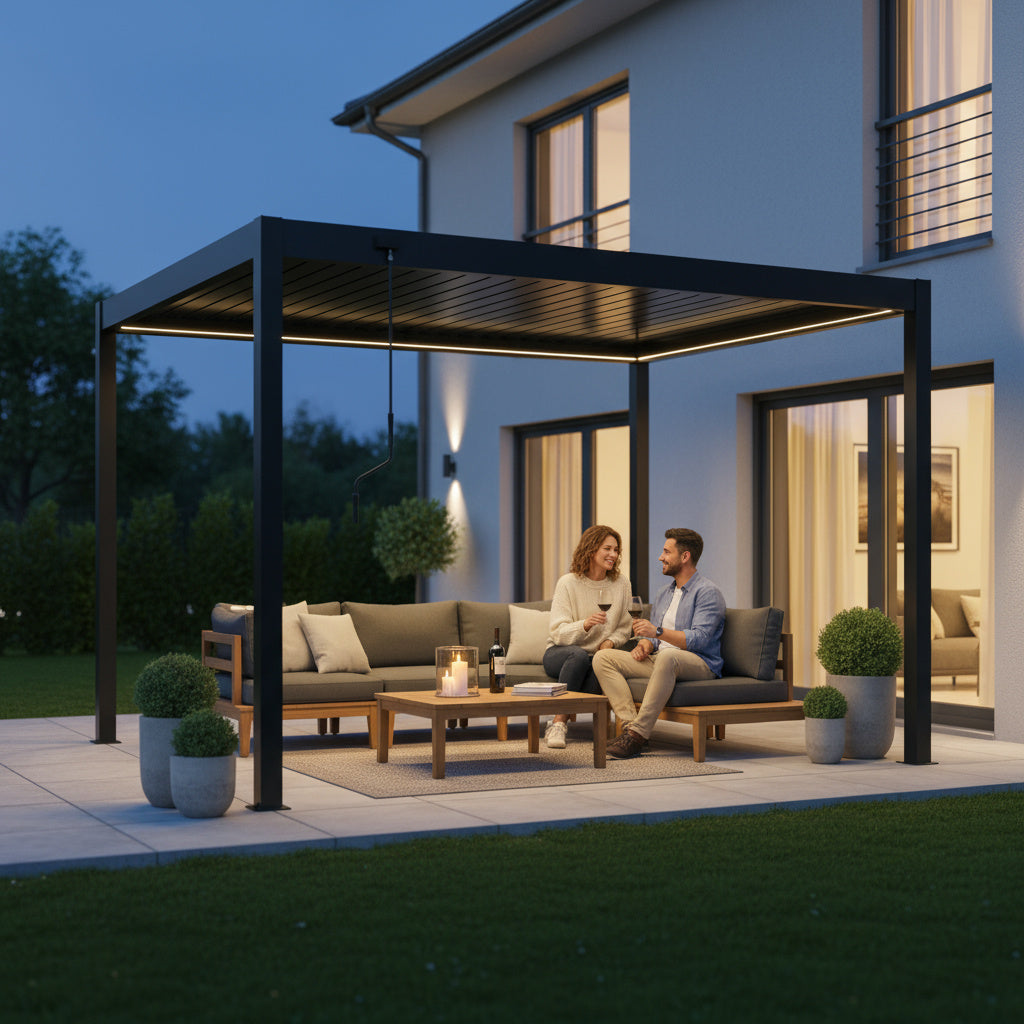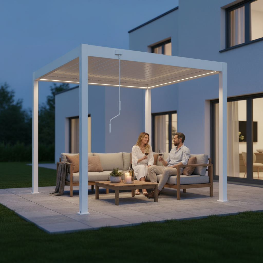 An Ihrer Sky Pergola können Sie verschiedenes praktisches Zubehör anbringen, um Komfort und Funktionalität weiter zu erhöhen. Dazu zählen feste oder verschiebbare Lamellenwände als seitlicher Sicht- und Windschutz, elegante Glaswände für transparenten Wetterschutz sowie Seitenrollos, die je nach Wunsch manuell oder motorisiert bedient werden können. Für angenehme Temperaturen auch an kühleren Tagen lassen sich Infrarot-Heizstrahler montieren, während Ventilatoren an heissen Sommertagen für eine bessere Luftzirkulation sorgen. Zusätzlich kann ein Regensensor integriert werden, der die Lamellen bei einsetzendem Regen automatisch schliesst. So wird Ihre Sky Pergola zu einem ganzjährig nutzbaren Rückzugsort im Aussenbereich.