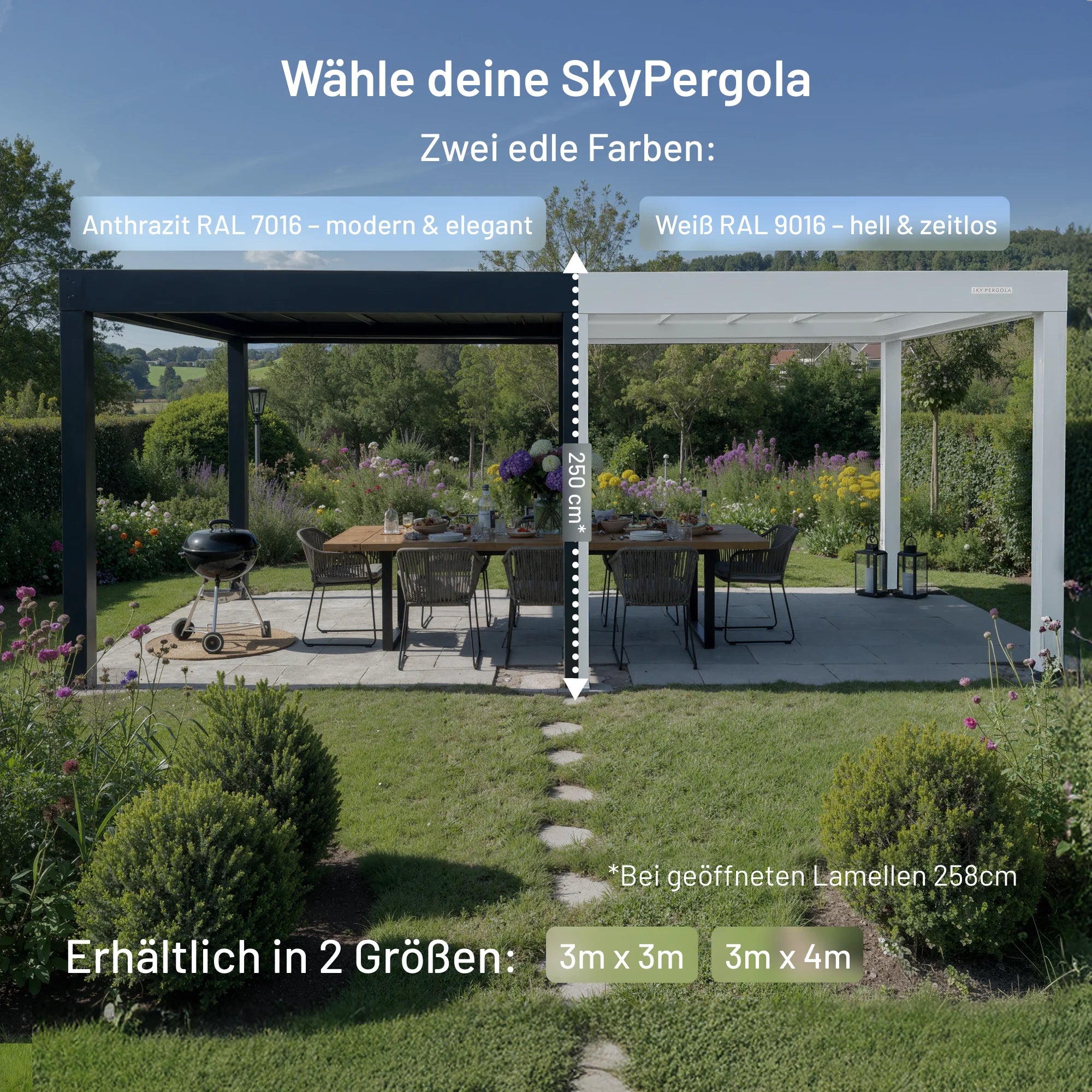 Die Standardhöhe der Sky Pergola beträgt 250 cm. Bei geöffneten Lamellen kommen zusätzlich ca. 8 cm hinzu, sodass die Gesamthöhe in geöffnetem Zustand ca. 258 cm beträgt.