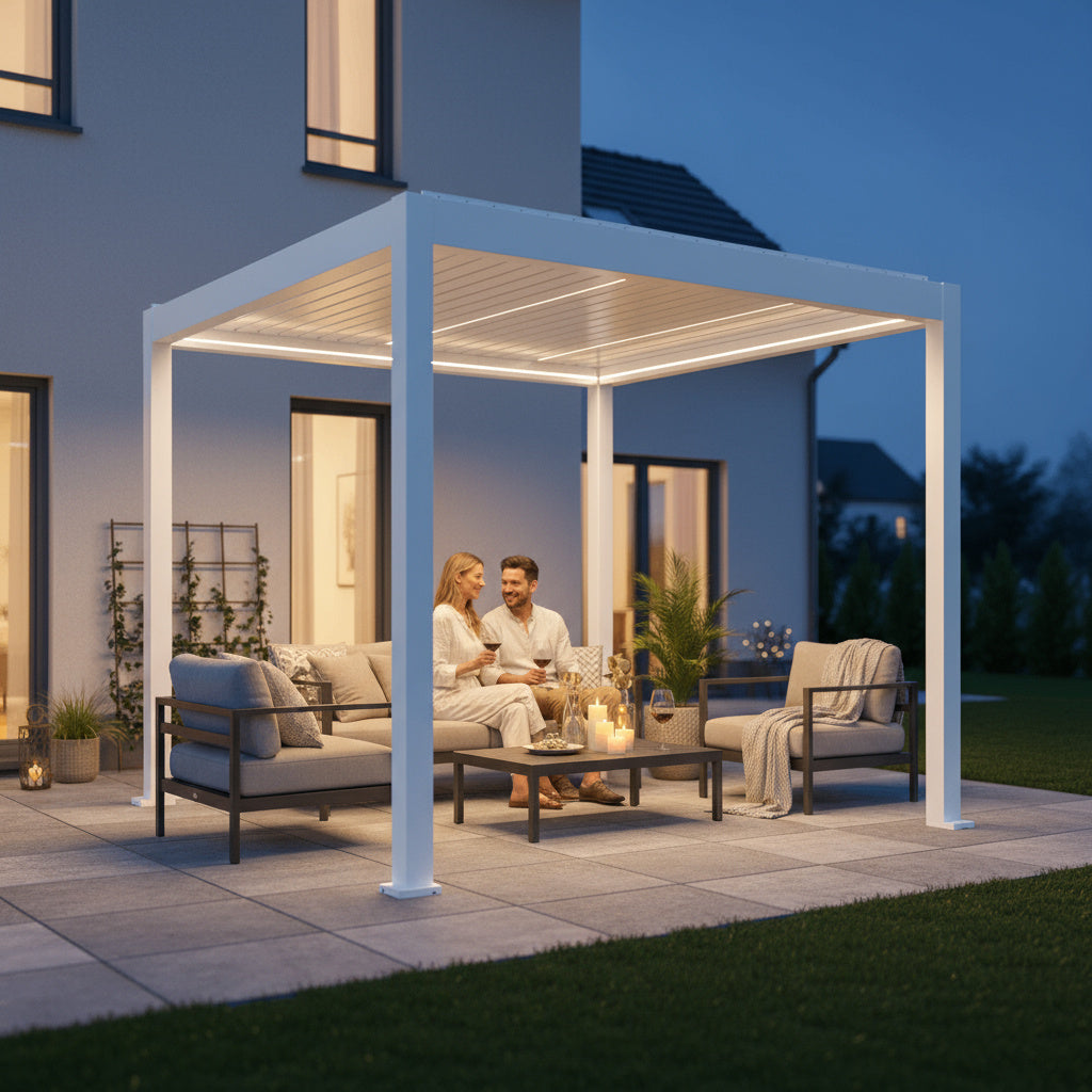 Unsere Sky Pergolen sind mit einem intelligenten Lamellendach ausgestattet, das sich per Knopfdruck öffnen und schliessen lässt. Integrierte Regenrinnen sorgen dafür, dass Sie auch bei einem Sommerregen angenehm trocken bleiben. Dank durchdachtem Zubehör können Sie Ihre Sky Pergola das ganze Jahr über nutzen – ob bei Sonne, Wind oder Regen.