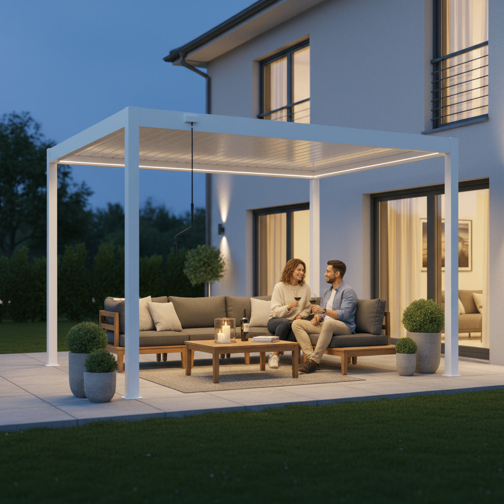 An Ihrer Sky Pergola können Sie verschiedenes praktisches Zubehör anbringen, um Komfort und Funktionalität weiter zu erhöhen. Dazu zählen feste oder verschiebbare Lamellenwände als seitlicher Sicht- und Windschutz, elegante Glaswände für transparenten Wetterschutz sowie Seitenrollos, die je nach Wunsch manuell oder motorisiert bedient werden können. Für angenehme Temperaturen auch an kühleren Tagen lassen sich Infrarot-Heizstrahler montieren, während Ventilatoren an heissen Sommertagen für eine bessere Luftzirkulation sorgen. Zusätzlich kann ein Regensensor integriert werden, der die Lamellen bei einsetzendem Regen automatisch schliesst. So wird Ihre Sky Pergola zu einem ganzjährig nutzbaren Rückzugsort im Aussenbereich.